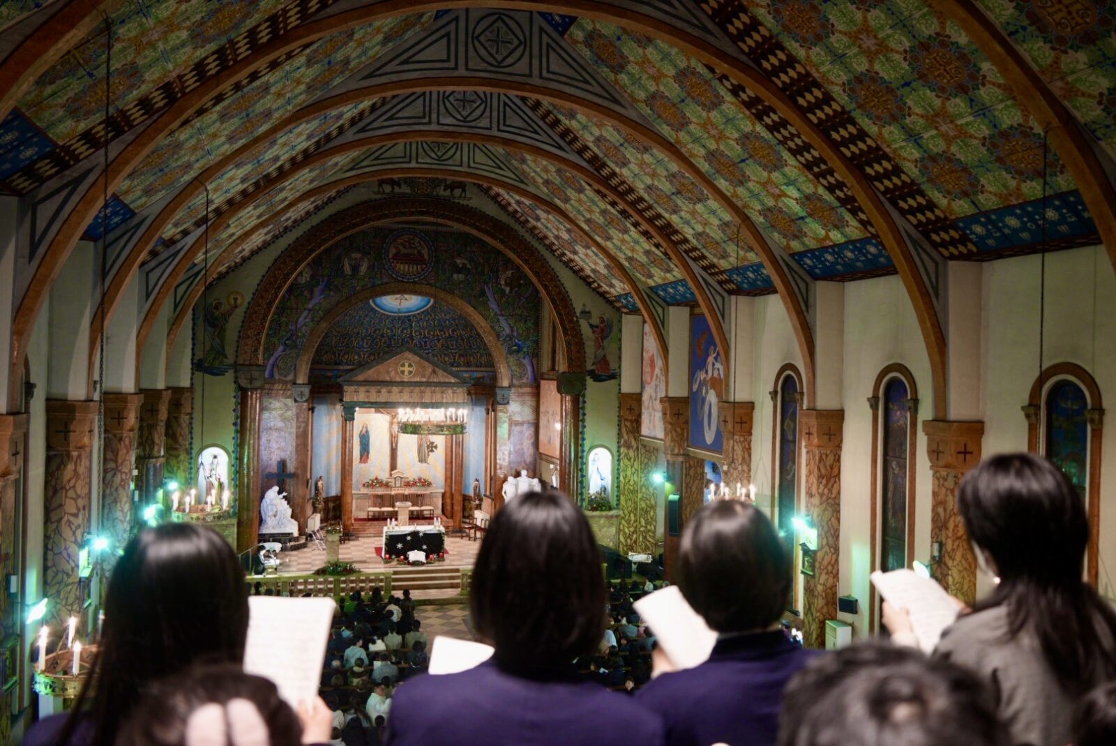 毎年、本校の聖歌隊は、お隣のカトリック碑文谷教会(サレジオ教会)にて、聖歌のご奉仕をさせていただいています。今年も、多くの在校生隊員に加え、OB・OGの皆さんが集まり、心を込めた素敵な歌声で、イエス様のご降誕に華を添えてくれました。