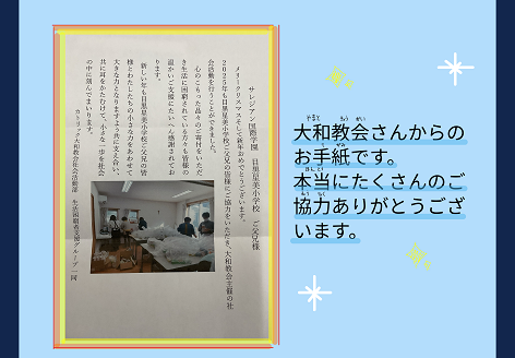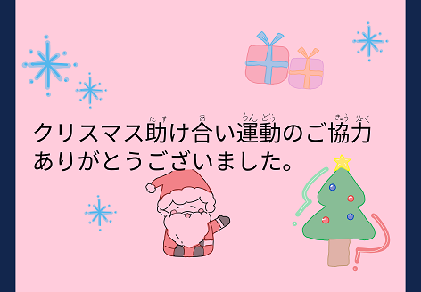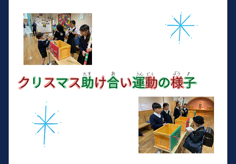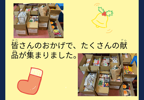 今朝の朝礼では、児童会の子どもたちが、昨年末に行ったクリスマス助け合い運動の報告を行いました。保護者の皆様のご協力により、たくさんの献品が集まり、生活困窮者や滞日外国人のために働いている団体や教会に送ることができました。