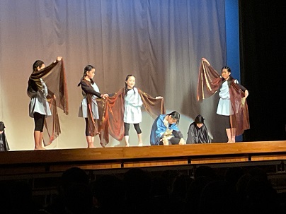 第2部は、5年生による「走れメロス」の宗教劇の発表でした。5年生は、毎日の練習の成果を発揮し、「信じ合うことの大切さ」「あきらめずに最後まで力を尽くすこと」などのメッセージを伝えてくれました。