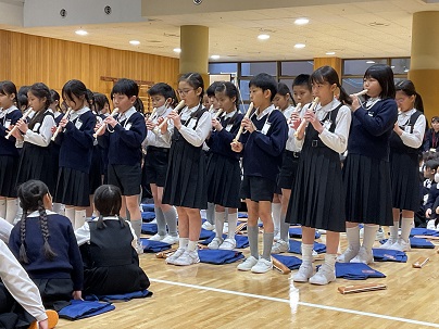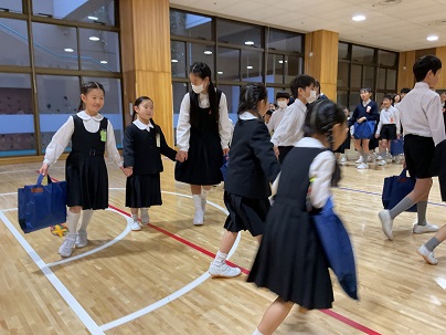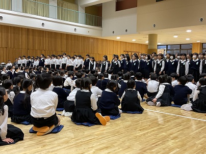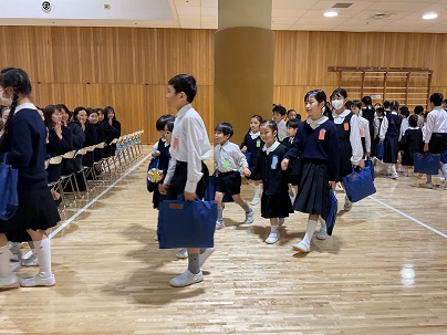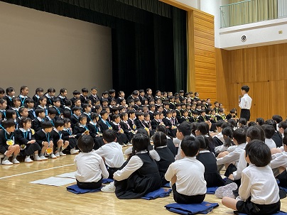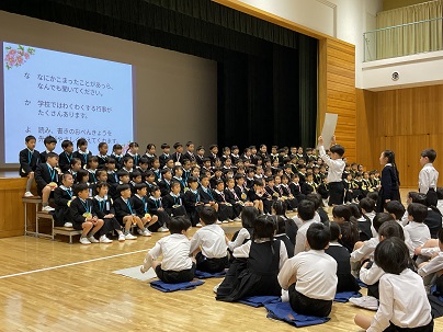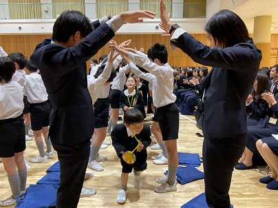各学年からの出し物に真剣に耳を傾ける1年生の様子はとても落ち着いていました。対面式後は、「線路は続くよどこまでも」の歌に合わせて、長いトンネルをくぐっての退場。微笑ましかったです♪