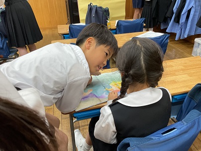 ペアのお兄さん、お姉さんに連れられて本を選びに行ったり、6年生に読んでもらったりしながら、落ち着いて一日を始めています!