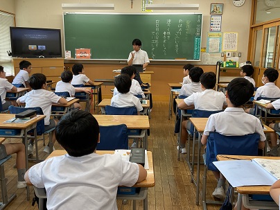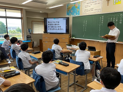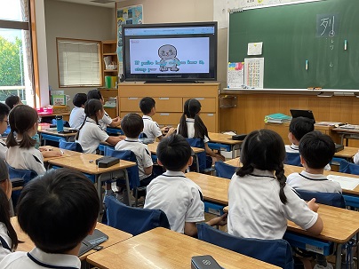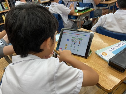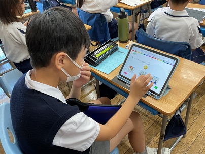 毎週木曜日は、担任の先生が朝礼の話を担当します。クラスの子どもたちへのメッセージを伝える良い機会となっています。朝学習の英語は10分間ですが、それぞれiPadを手に、真剣に取り組んでいます。