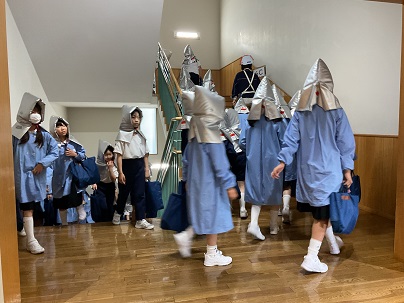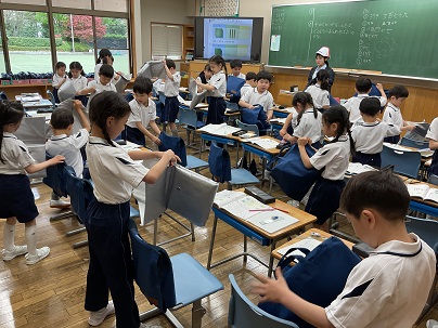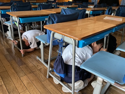 「地震発生」の放送とともに子ども達は黙って机の下に潜り、しっかりと机の足を持って身を守ることができました。また、専科の授業を行っていたクラスは、揺れがおさまった合図のあと各教室に戻りましたが、誰一人私語をすることなく、敏速に移動することができました。