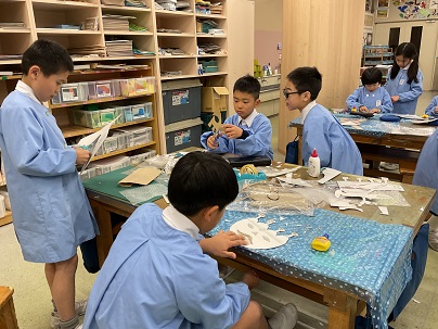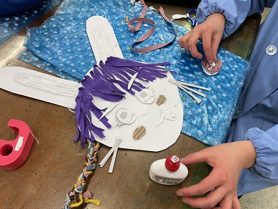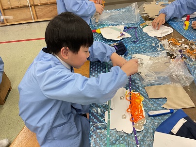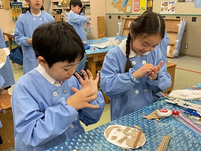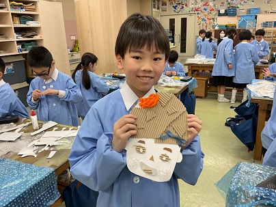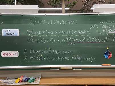 3年生の図工の単元は「ふくわらい」です。顔の形はもちろん、髪型、耳、目などを、工夫を凝らしながら作っています。作りながら自分で目を閉じ、目や口を顔の中に置いては楽しそうな笑い声が聞こえます。完成が楽しみです!