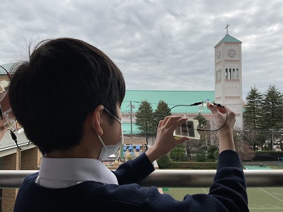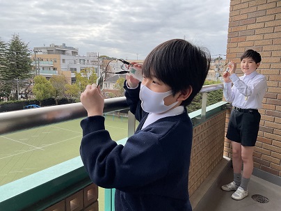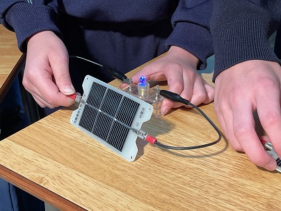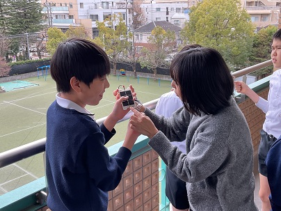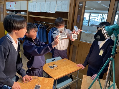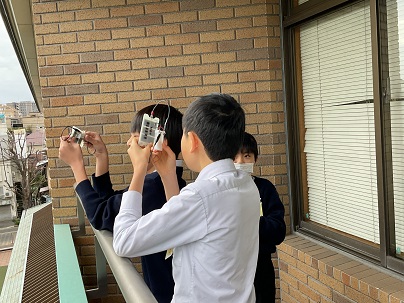6年生は、光電池を使って発電する実験を行っていました。光電池と光の当たり具合を考え、いろいろ試しながら進めていました。教室の中では明るい電気を使って、そして、ベランダでは曇っていましたが自然の光を使って。