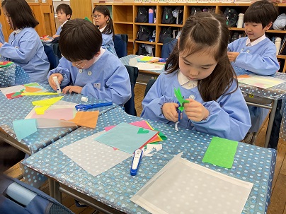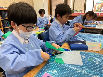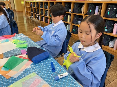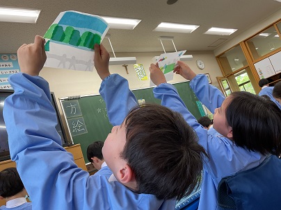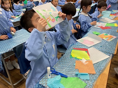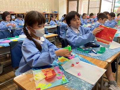 2年生は、図工の時間に造形遊び「色の見え方無限大」を学習しています。薄い色の紙を重ね、光に透かしてみると素敵な世界が広がります!楽しみながら取り組んでいました!