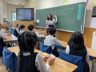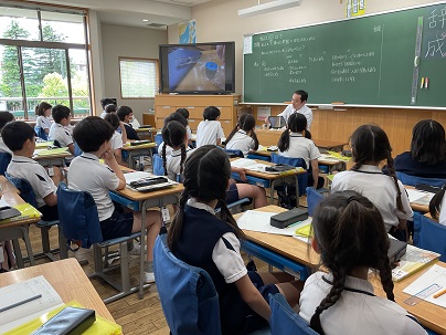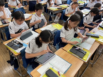 4年生の理科では、「粘土で満たした容器に棒磁石を入れると粘土はどれくらいあふれるか?」という実験です。それぞれ予想を立てて友達と意見交換し、2人で出した意見を、iPadで先生に送っていました。「圧縮」という言葉を発した友達の発言に、「圧縮って何?」と質問しながら、興味深く学習を進めていました。