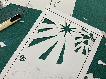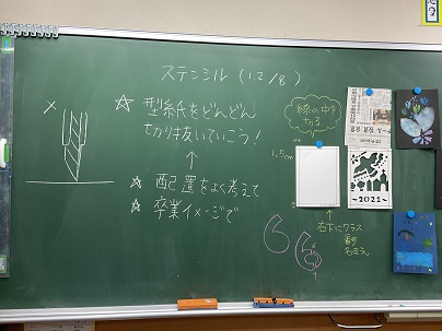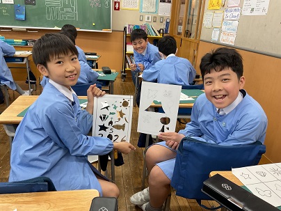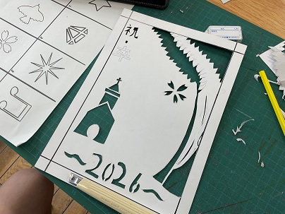 ステンシルで素敵な絵を描くために、丁寧に下書きをし、手を切らないように気をつけながら、厚紙をカッターで切り取ります。皆、楽しそうに作品と向き合っていました。5年生の器用さがたいへん光っていました!